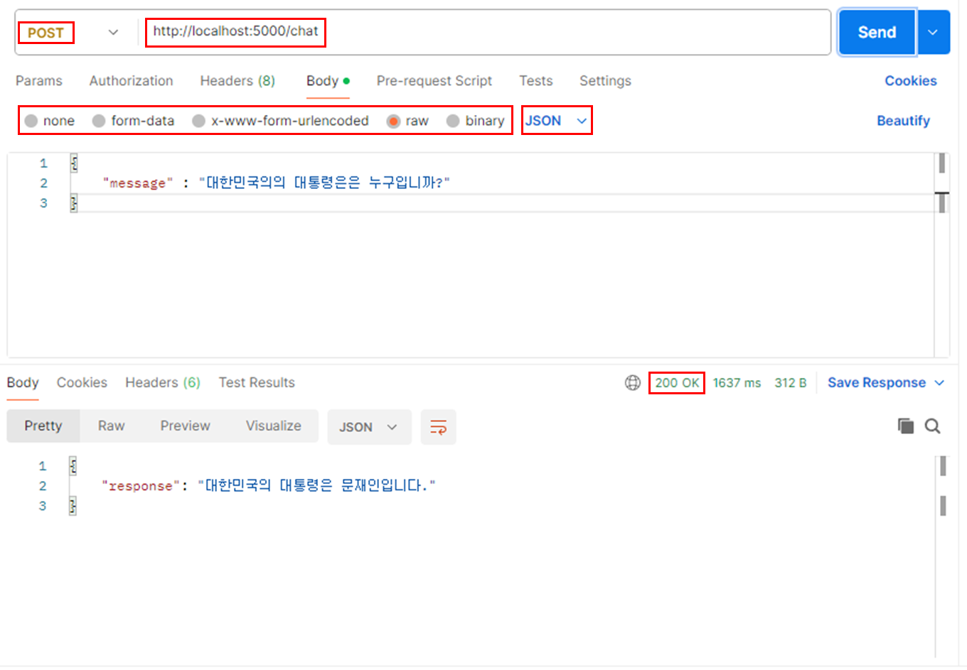 그리고 결과값을 확인, 위 이미지는 성공적으로 테스트 결과값이 나왔을 때(200) 모습이다.