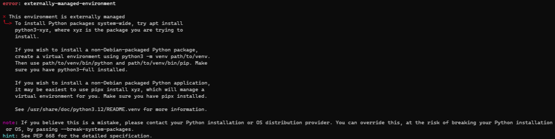 note: If you believe this is a mistake, please contact your Python installation or OS distribution provider. You can override this, at the risk of breaking your Python installation or OS, by passing --break-system-packages.