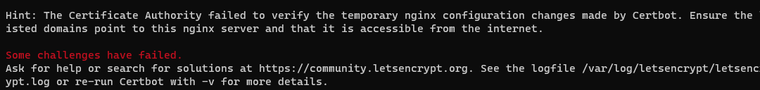 Timeout during connect (likely firewall problem) Hint: The Certificate Authority failed to verify the temporary nginx configuration changes made by Certbot. Ensure the listed domains point to this nginx server and that it is accessible from the internet.