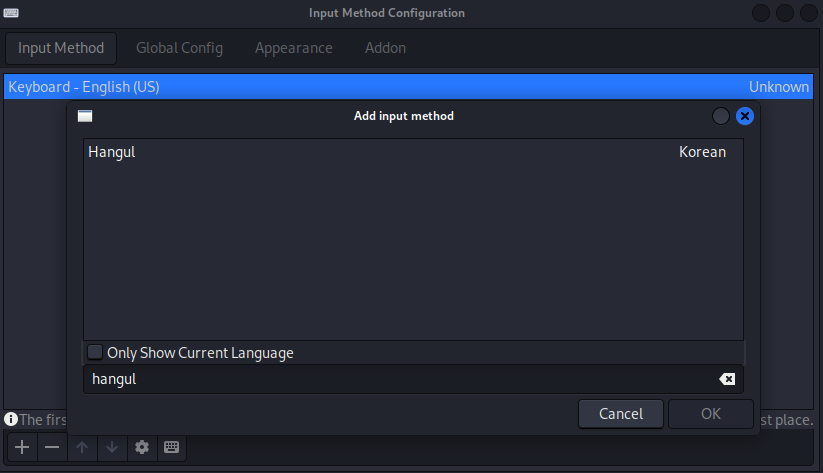+ 버튼을 누르고 only show current language를 체크 해제하고 hangul 추가한다.