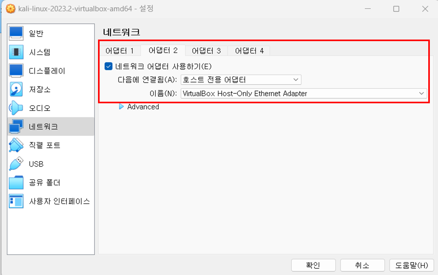 네트워크 -어댑터 2 호스트 전용 어댑터 를 눌러 사설망 사용하도록 한다.