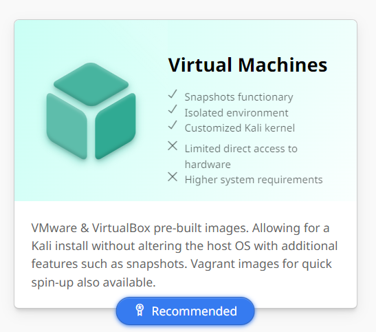칼리 홈페이지에서 Virtual Machines 탭을 누르고
