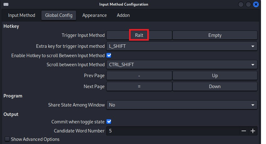 마지막으로 Global Config에 들어가 Trigger Input Method 의 왼쪽부분을 한/영키 (Ralt) 로 바꿔준다.