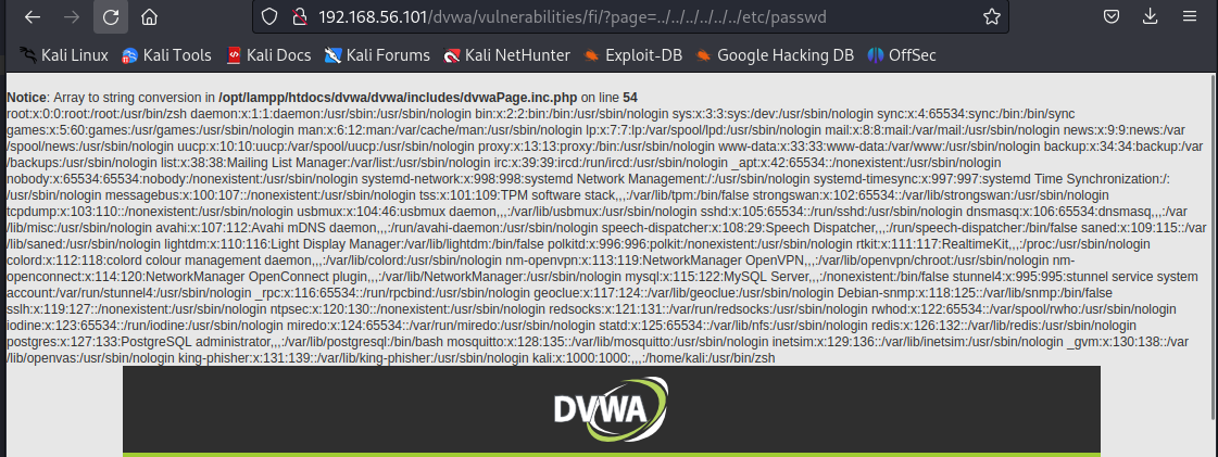 /etc/passwd 파일을 출력하는 코드를 입력하고 새로고침하면 역시 실행되는 모습이 보인다.